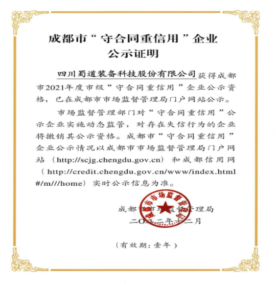 憑借長(zhǎng)期積累沉淀的深厚實(shí)力和精細(xì)化的內(nèi)控管理水平,蜀道裝備公司連續(xù)兩年通過成都市市場(chǎng)監(jiān)督管理局評(píng)定,獲得市級(jí)“守合同重信用”企業(yè)稱號(hào)。