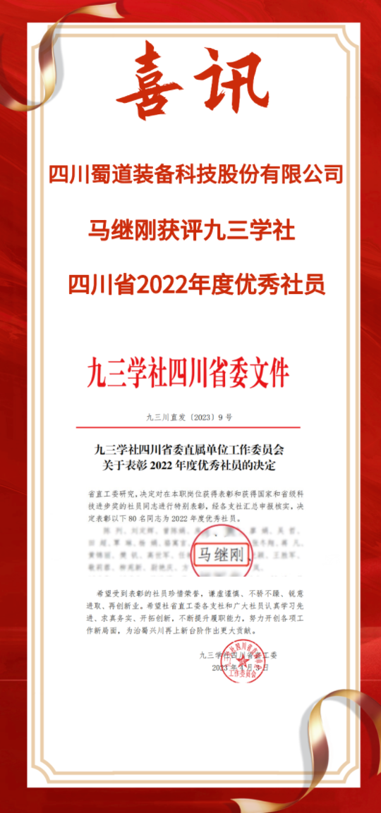 近日,九三學(xué)社四川省委直屬單位工作委員會對2022年度在本職崗位獲得表彰及獲得國家和省級科技進步獎的社員同志進行特別表彰。蜀道裝備公司副總經(jīng)理、董事會秘書馬繼剛獲評2022年度“優(yōu)秀社員”稱號。
