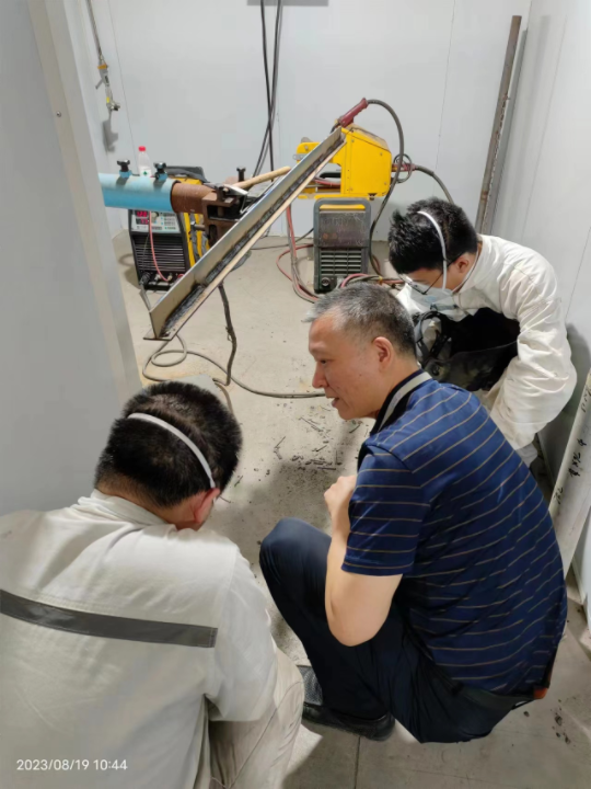 8月15日三位新同事正式進(jìn)入“張建岳焊接技能大師工作室”開展培訓(xùn),第一周培訓(xùn)內(nèi)容為電焊、氬弧焊的平焊、平角焊的練習(xí),三位同事在車間主任許偉明的指導(dǎo)下,很快進(jìn)入角色,抓緊時(shí)間練習(xí)焊接技術(shù)。周末期間,公司生產(chǎn)部部長(zhǎng)、成都工匠張建岳來到車間現(xiàn)場(chǎng)指導(dǎo)仍在練習(xí)的學(xué)員,親自操作演示,檢查焊接試件,耐心解答學(xué)員們的問題,并授予他們焊接方法、心得。
