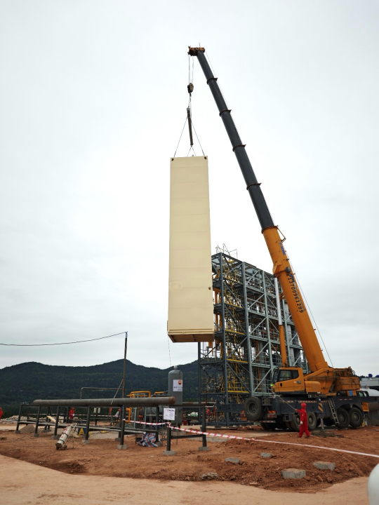 該產(chǎn)品結(jié)合公司科技成果的核心工藝,設(shè)計(jì)并制造了高度模塊化的撬裝裝置,將天然氣凈化、液化工藝設(shè)備、控制模塊、儀電控設(shè)施等全部集成在數(shù)個(gè)撬塊中。專業(yè)工廠內(nèi)完成所有撬塊內(nèi)的施工安裝工作,現(xiàn)場(chǎng)僅需完成撬塊吊裝就位、撬間管道連接以及少量公用工程施工,極大減少了現(xiàn)場(chǎng)施工量,降低了現(xiàn)場(chǎng)施工難度和施工周期。