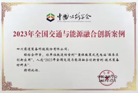 本次榮譽的獲得,充分展示了蜀道裝備公司的技術優(yōu)勢和研發(fā)實力,也是蜀道裝備公司繼獲得“2022全國高速公路服務區(qū)優(yōu)秀創(chuàng)新應用成果”獎項之后,在交通與能源創(chuàng)新領域獲得的又一項國家級殊榮。
