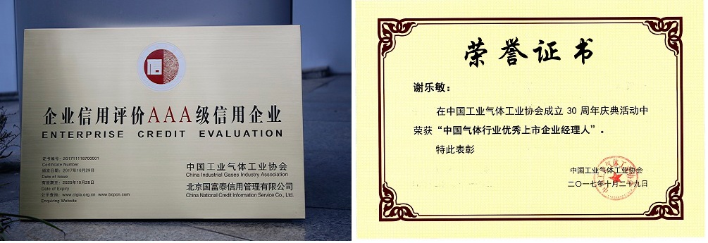 同時我公司還被中國工業(yè)氣體工業(yè)協(xié)會評定為“AAA企業(yè)信用等級”企業(yè),并榮獲信用等級證書及牌匾。