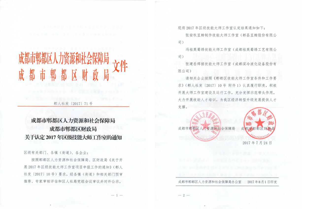 我公司申報的“張建岳焊接技能大師工作室”通過專家審核評估、區(qū)人社局審議,于2017年7月被認定為郫都區(qū)技能大師工作室。