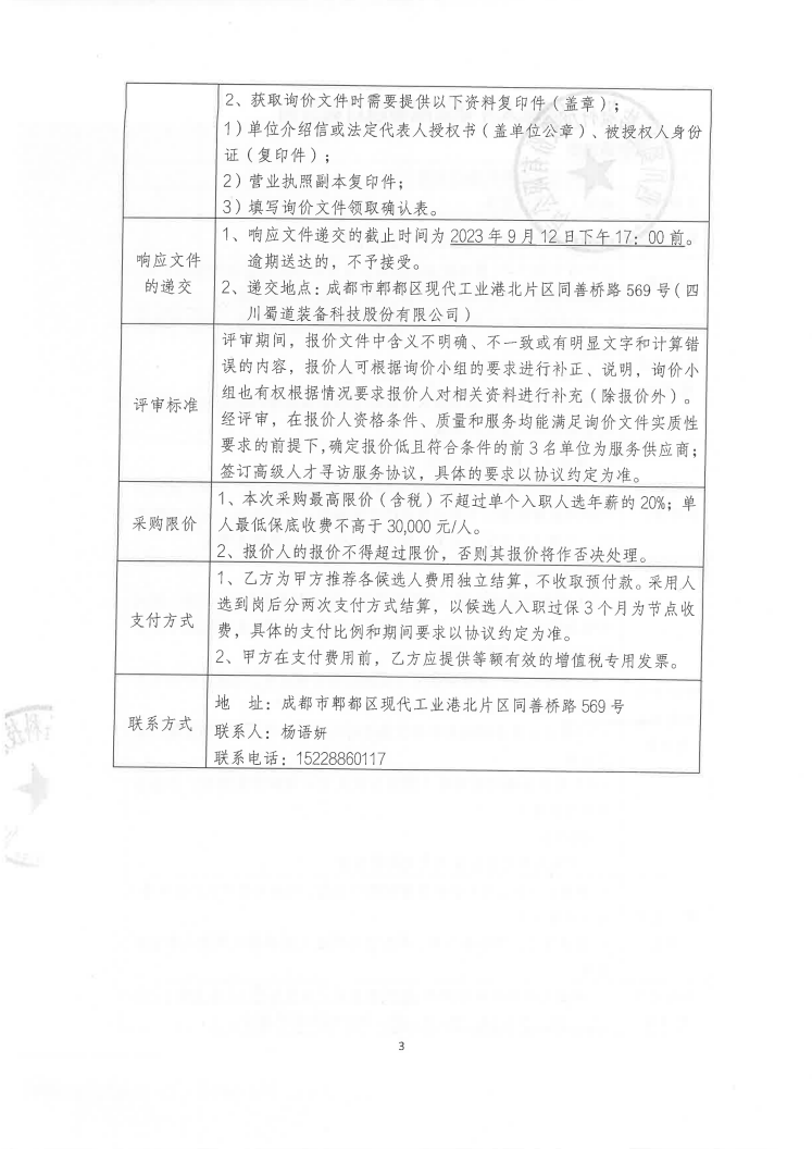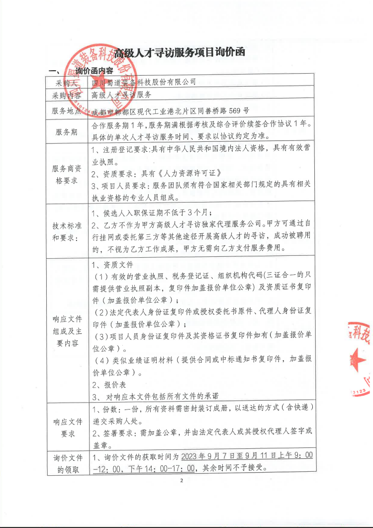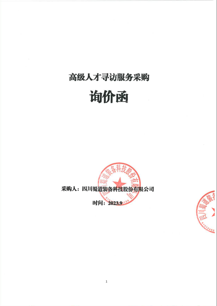 四川蜀道裝備科技股份有限公司高級(jí)人才尋訪服務(wù)采購詢價(jià)函