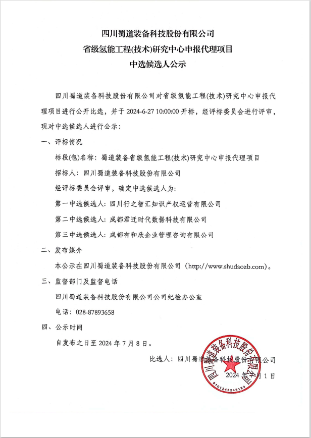 蜀道裝備公司省級氫能工程(技術(shù))研究中心申報(bào)代理中標(biāo)候選人公示