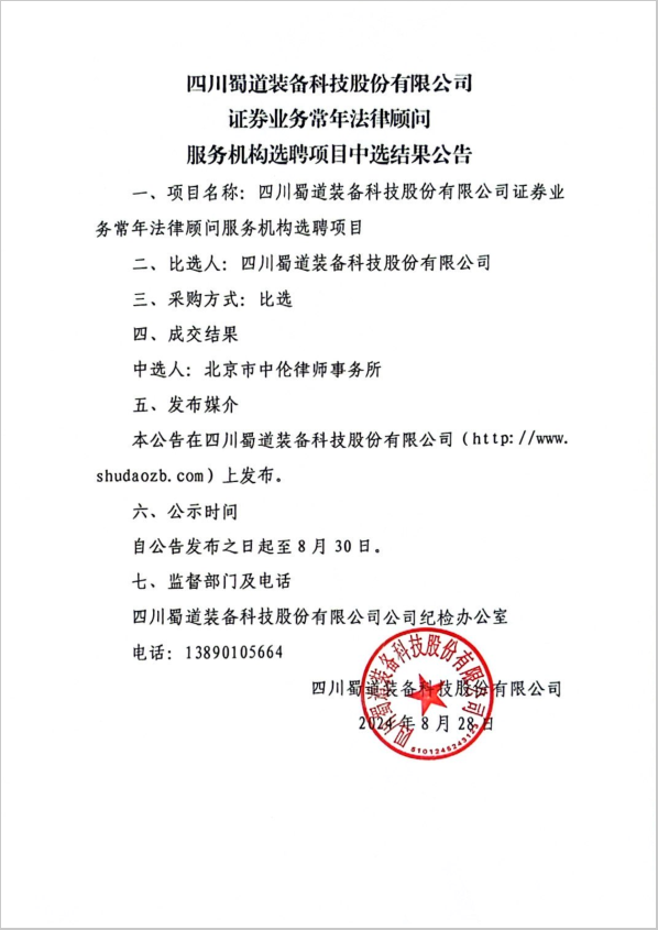 四川蜀道裝備科技股份有限公司證券業(yè)務(wù)常年法律顧問服務(wù)機(jī)構(gòu)選聘項(xiàng)目中選結(jié)果公告